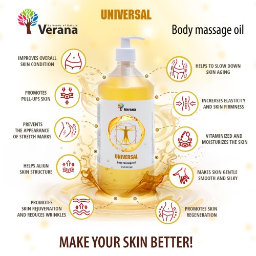 Body massage oil Verana «Universal» is designed for effective care of the entire body and face, as well as for various types and techniques of massage.